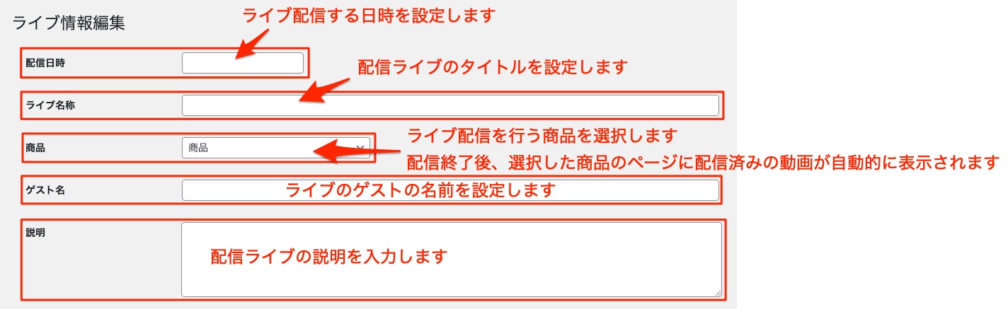 運営管理画面から【ライブコマース】>【新規作成】をクリックすると新規作成のページが開きます。