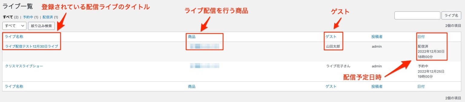 登録されたライブ配信は、一覧表示することができます。