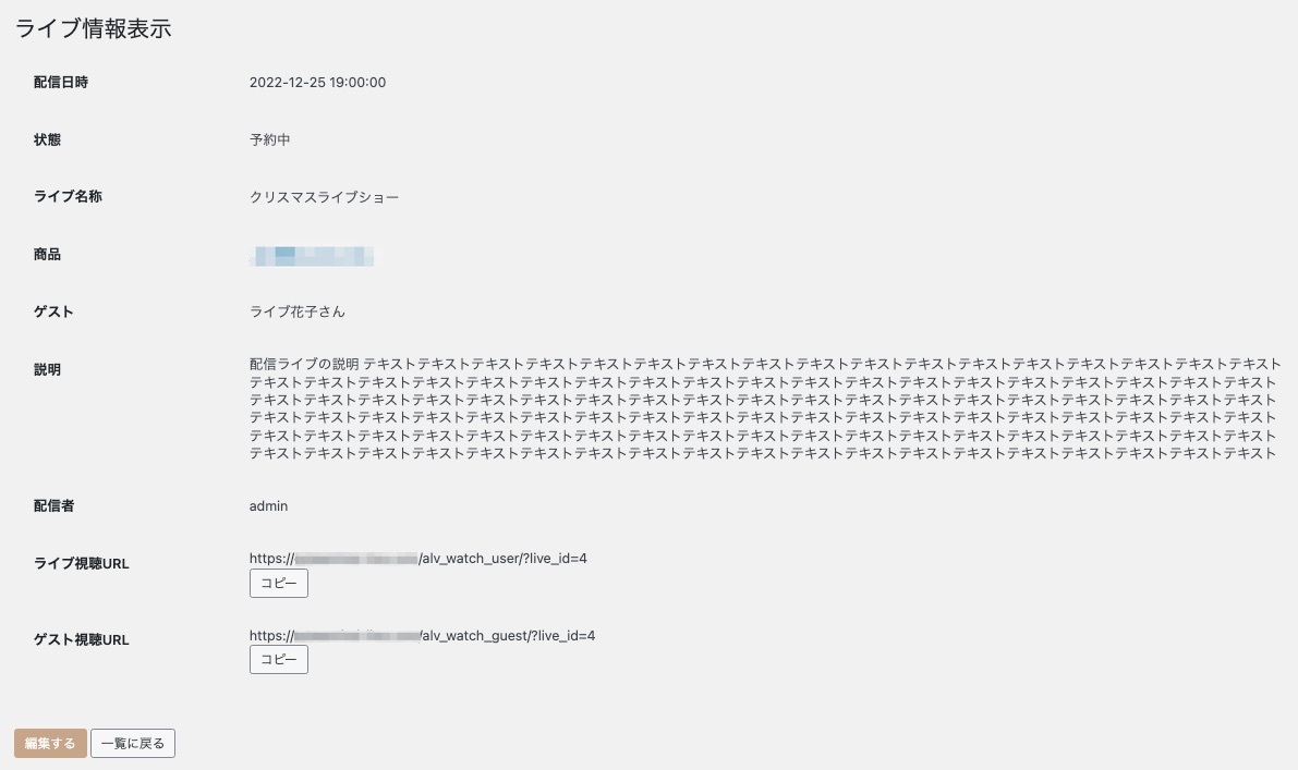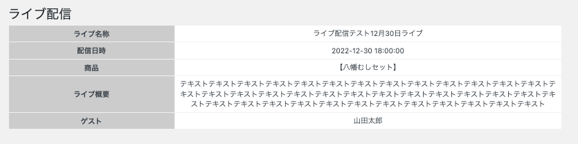 運営管理画面から【ライブコマース】>【ライブ一覧】で開いたライブ一覧から、編集したいライブ配信の「ライブ名称」をクリックすると以下のような「ライブ情報」が表示されます。