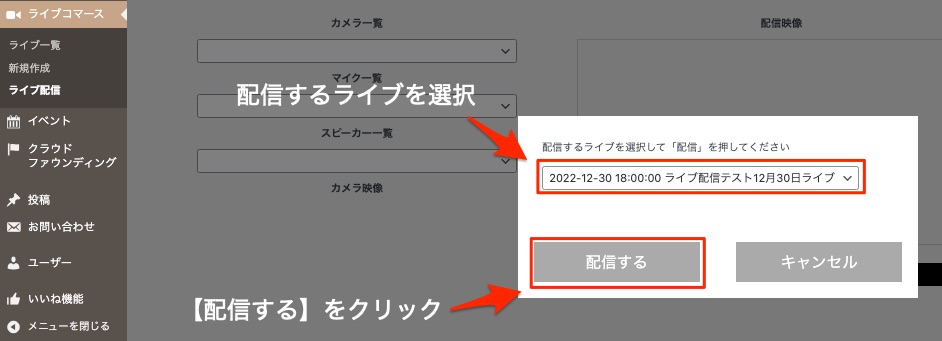 ライブ配信の予定日時になりましたら、運営管理画面から【ライブコマース】>【ライブ配信】をクリックし、ダイアログに表示される予定済み配信ライブのリストから、配信するライブを選択します。