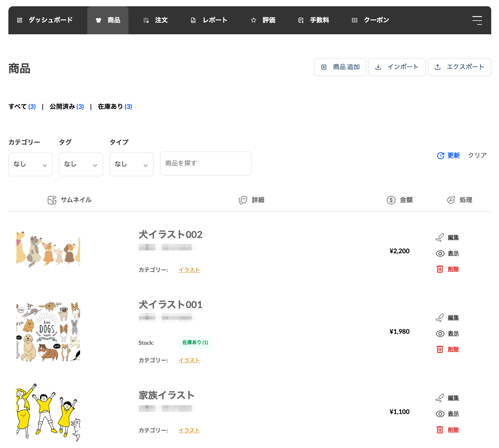 ショップダッシュボードの商品タブではご自身のショップに登録済みの商品一覧が表示されます。