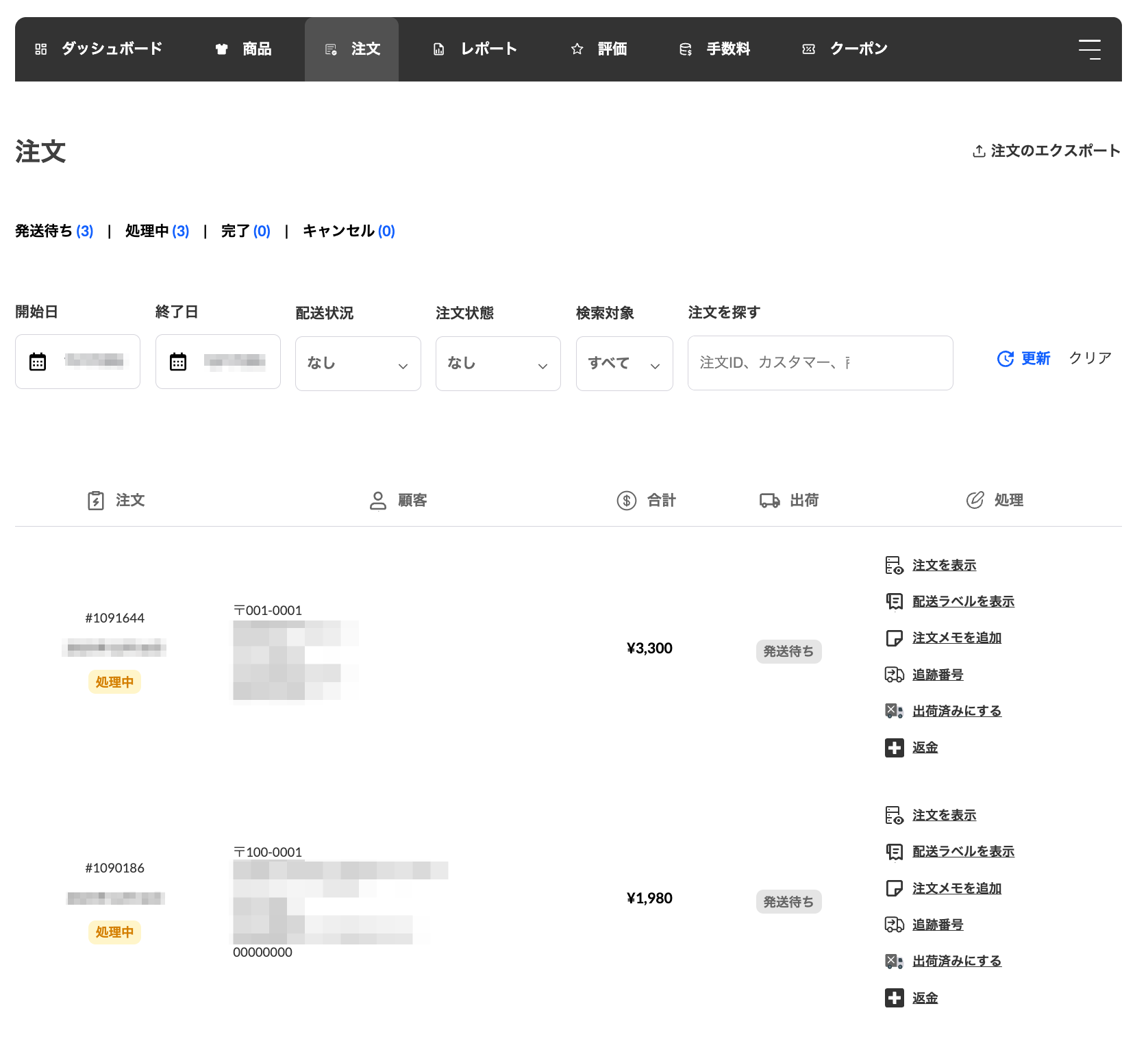 ショップダッシュボードで【注文】タブを開くと注文の一覧が表示されます。